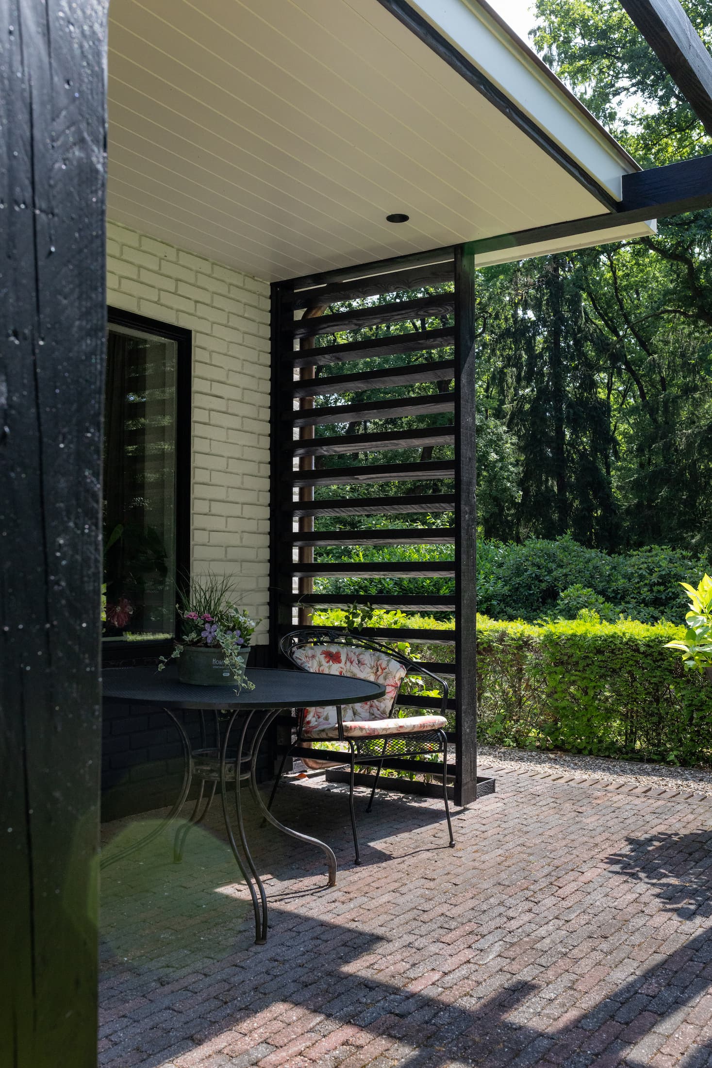 In deze royale tuin in Hoenderloo realiseerden we een open houten overkapping in landelijke stijl. De wens: een plek creëren waar schaduw, openheid en natuurlijke materialen samenkomen – midden in het groen.